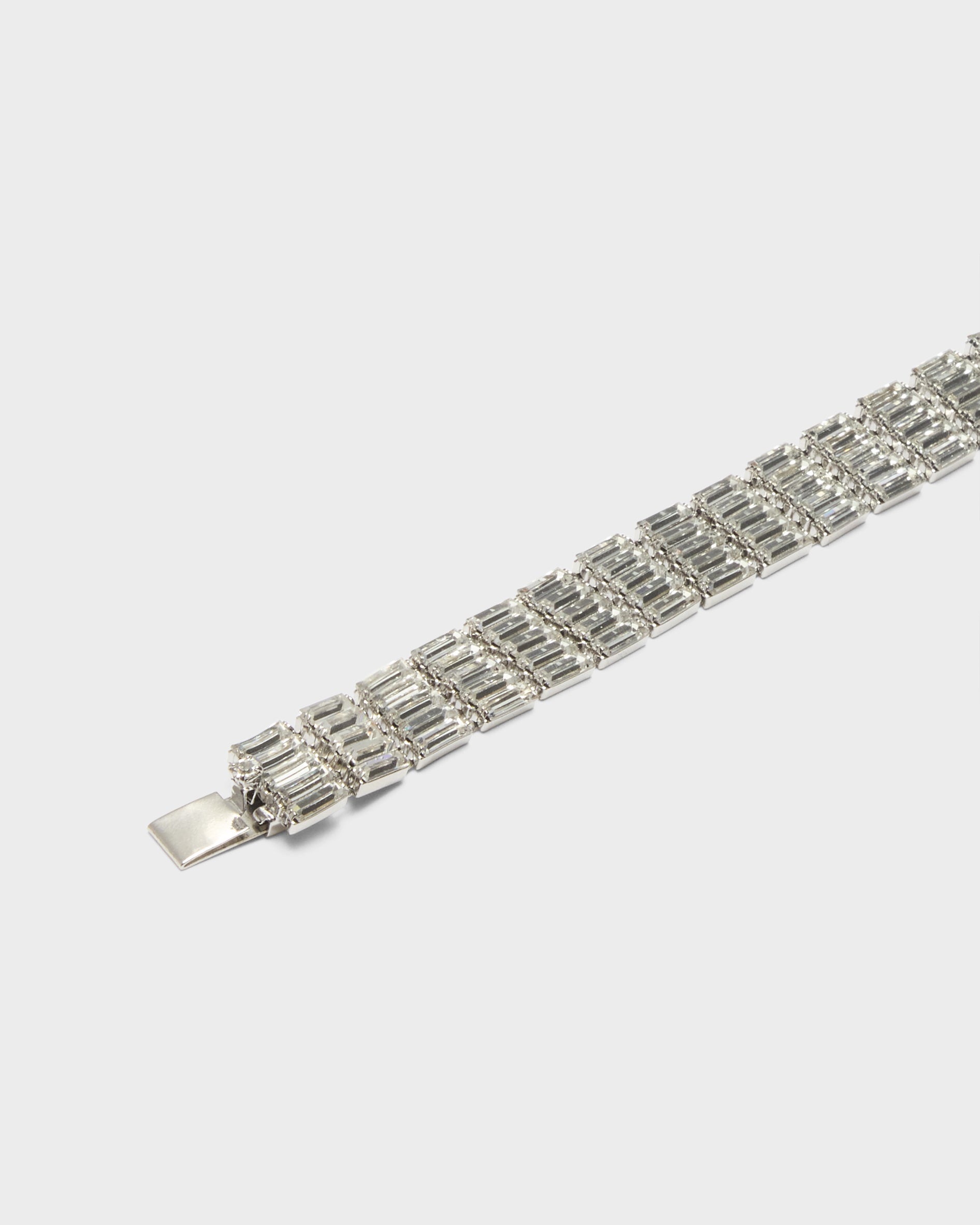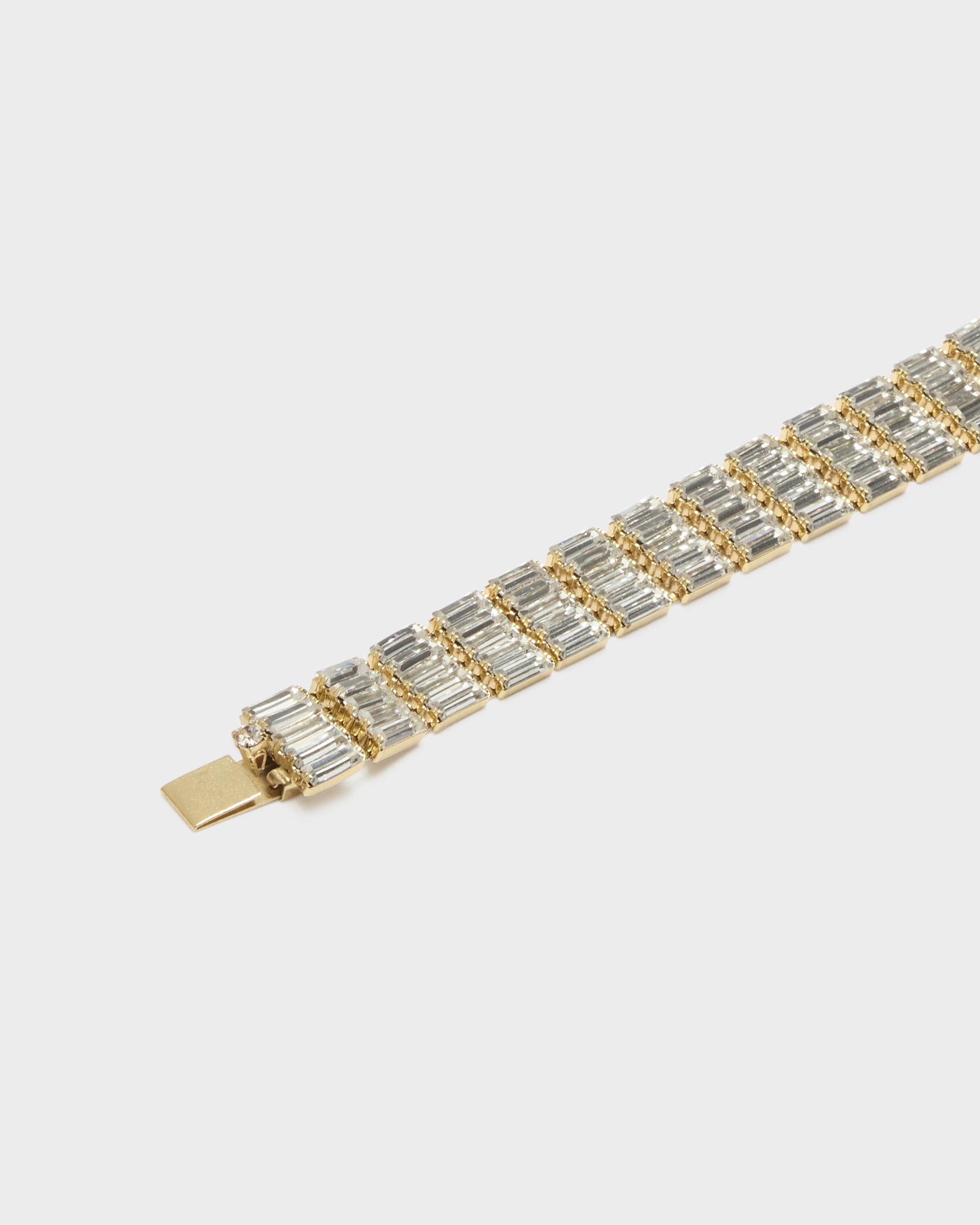 Plated brass bracelet. Five rows of baguette-cut crystals. Snap closure with crystal. Handcrafted.