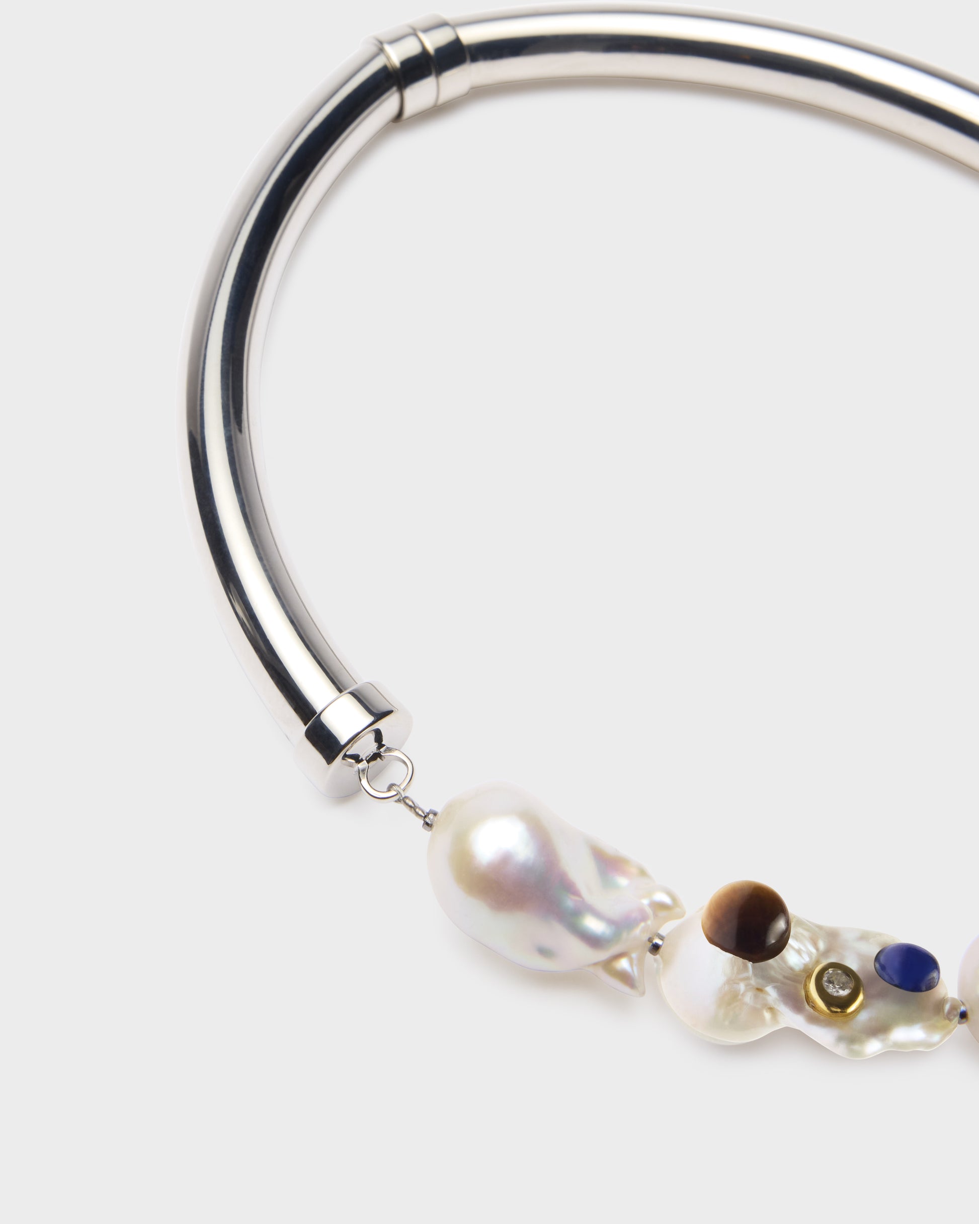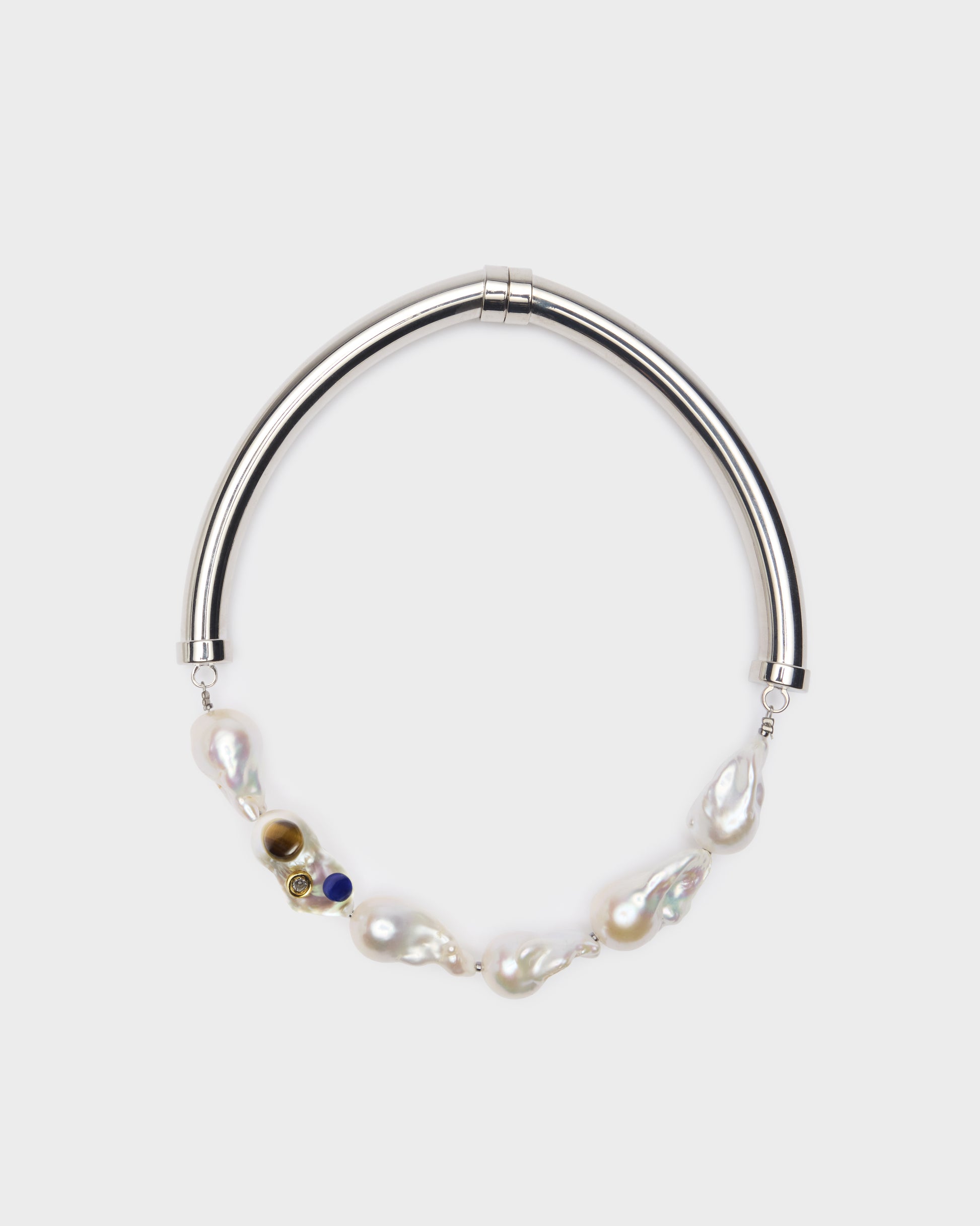 Palladium-plated brass necklace with a baroque pearl and a tiger's eye and lapis lazuli cabochon. Magnetic lock. Handcrafted.