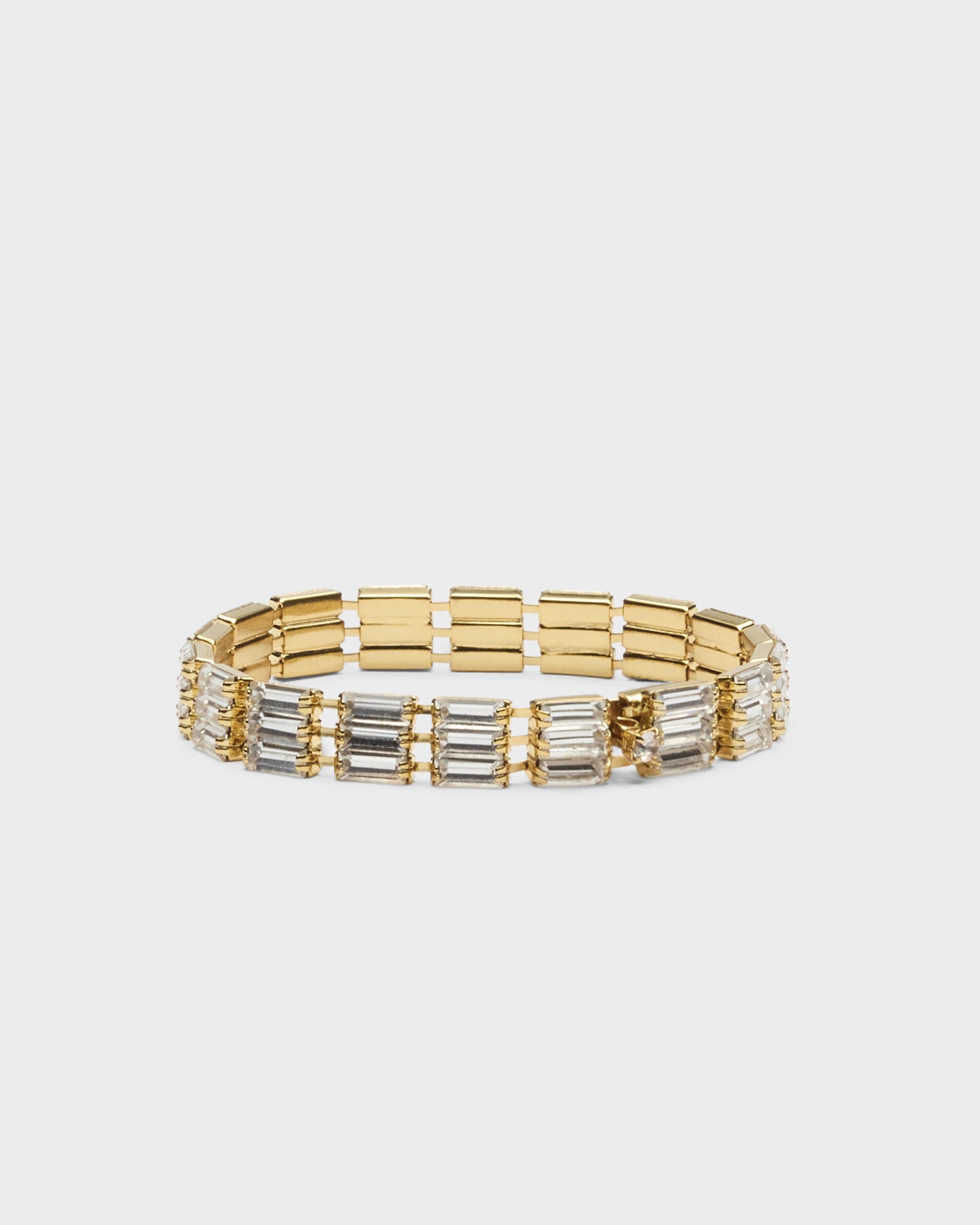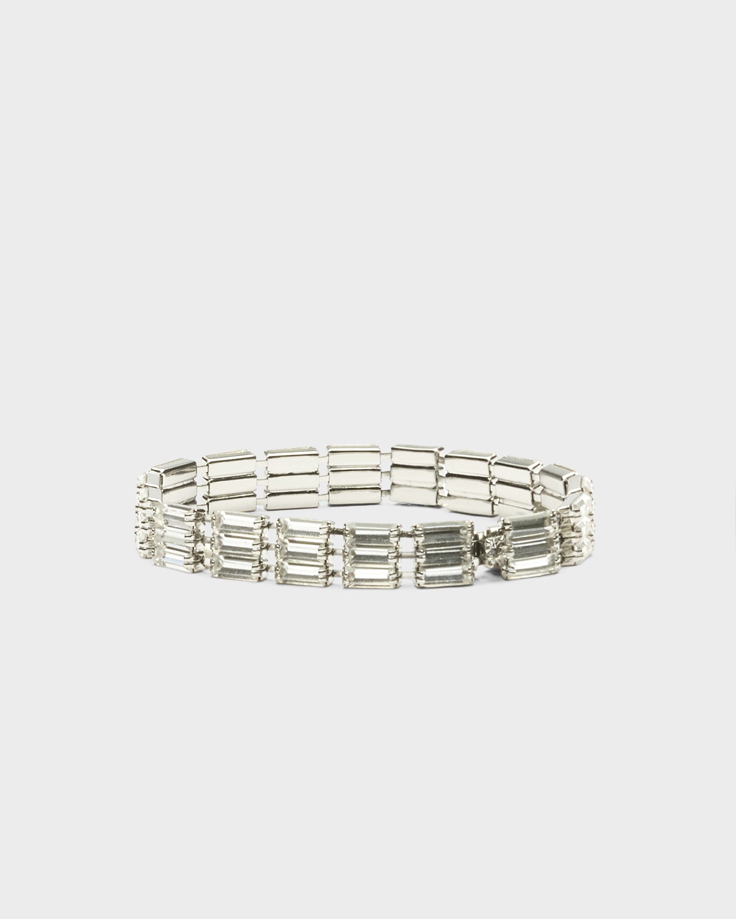 Bracciale in ottone placcato. 3 file di cristalli a taglio baguette. Chiusura a scatto con cristallo. Lavorazione artigianale.