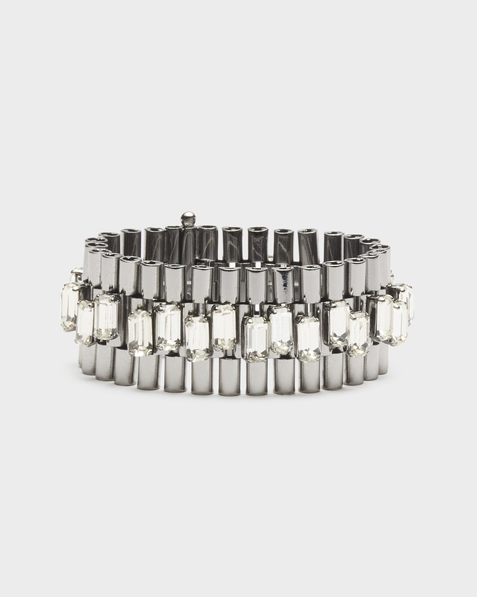 Bracciale in ottone placcato e cristalli a taglio baguette. Chiusura scorrevole. Lavorazione artigianale.