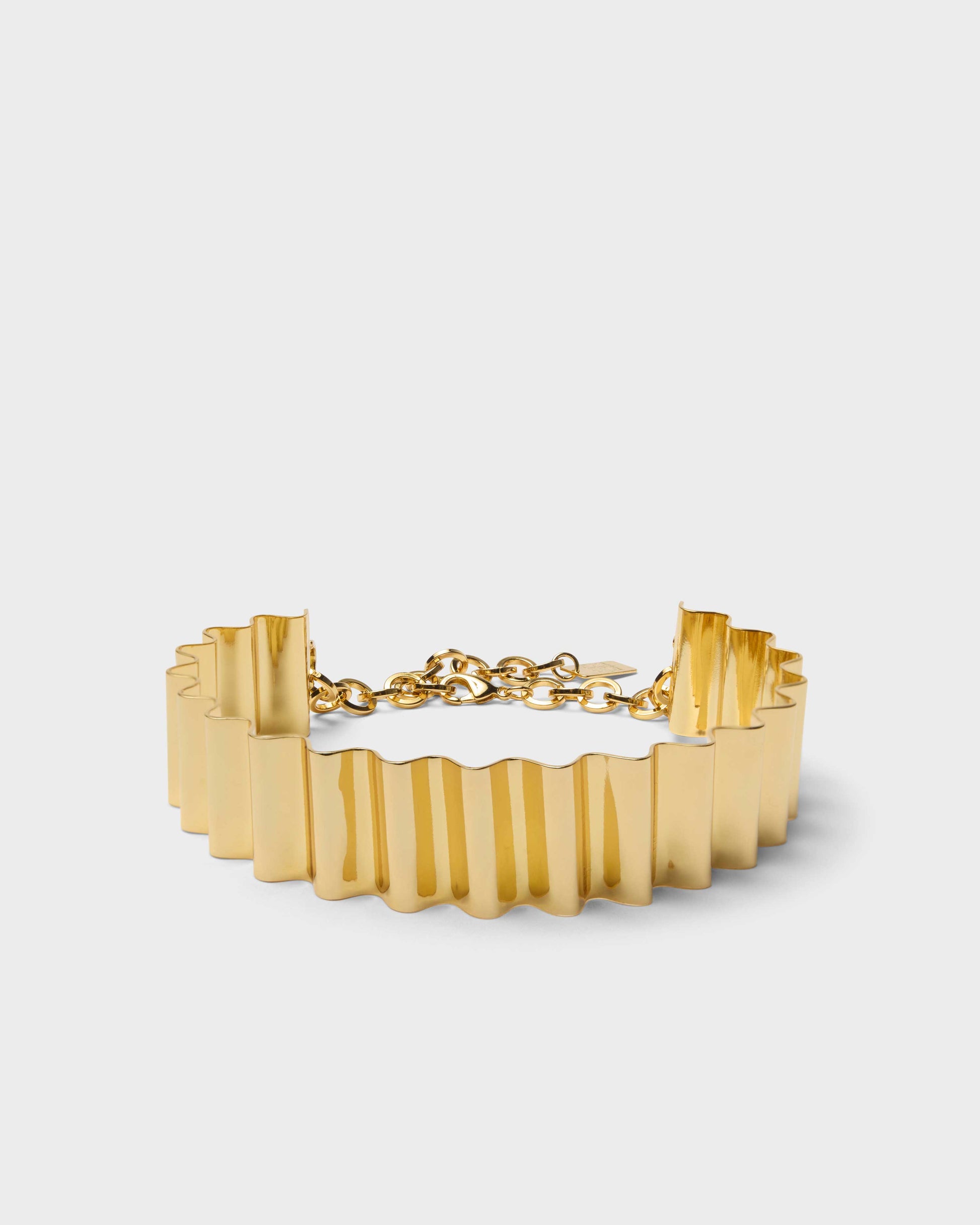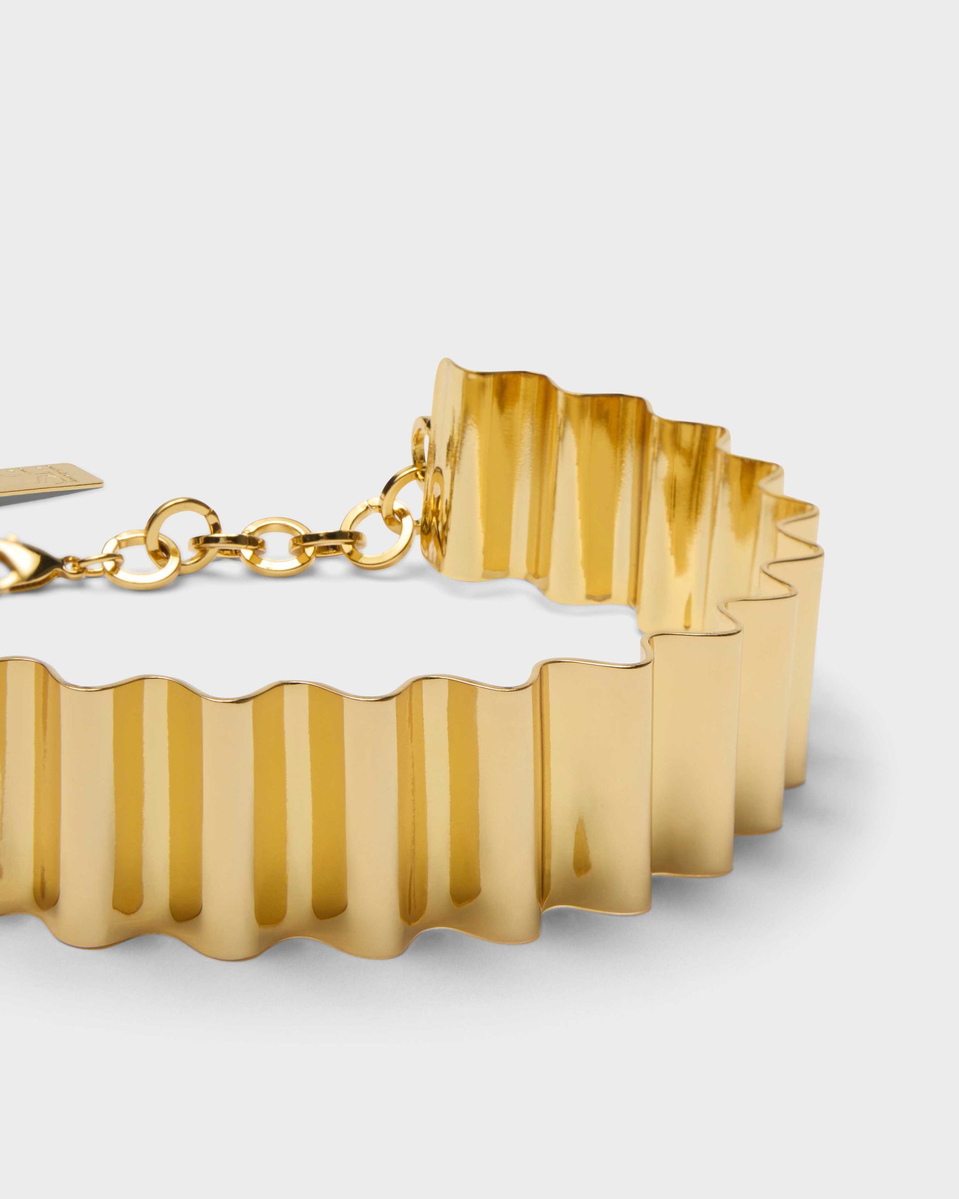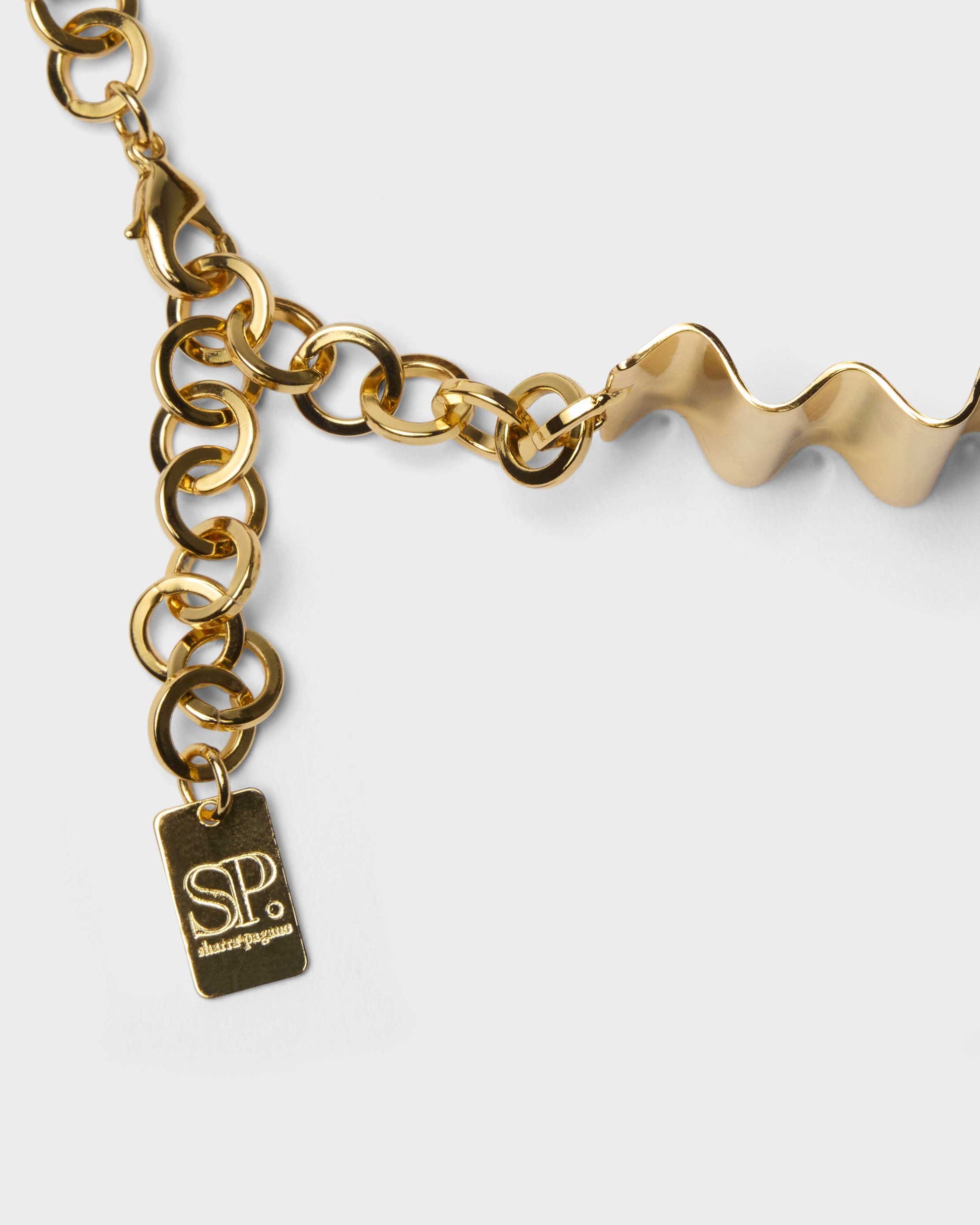 Collana choker in ottone placcato oro. Lavorazione artigianale a onde. Chiusura regolabile con catena e moschettone.