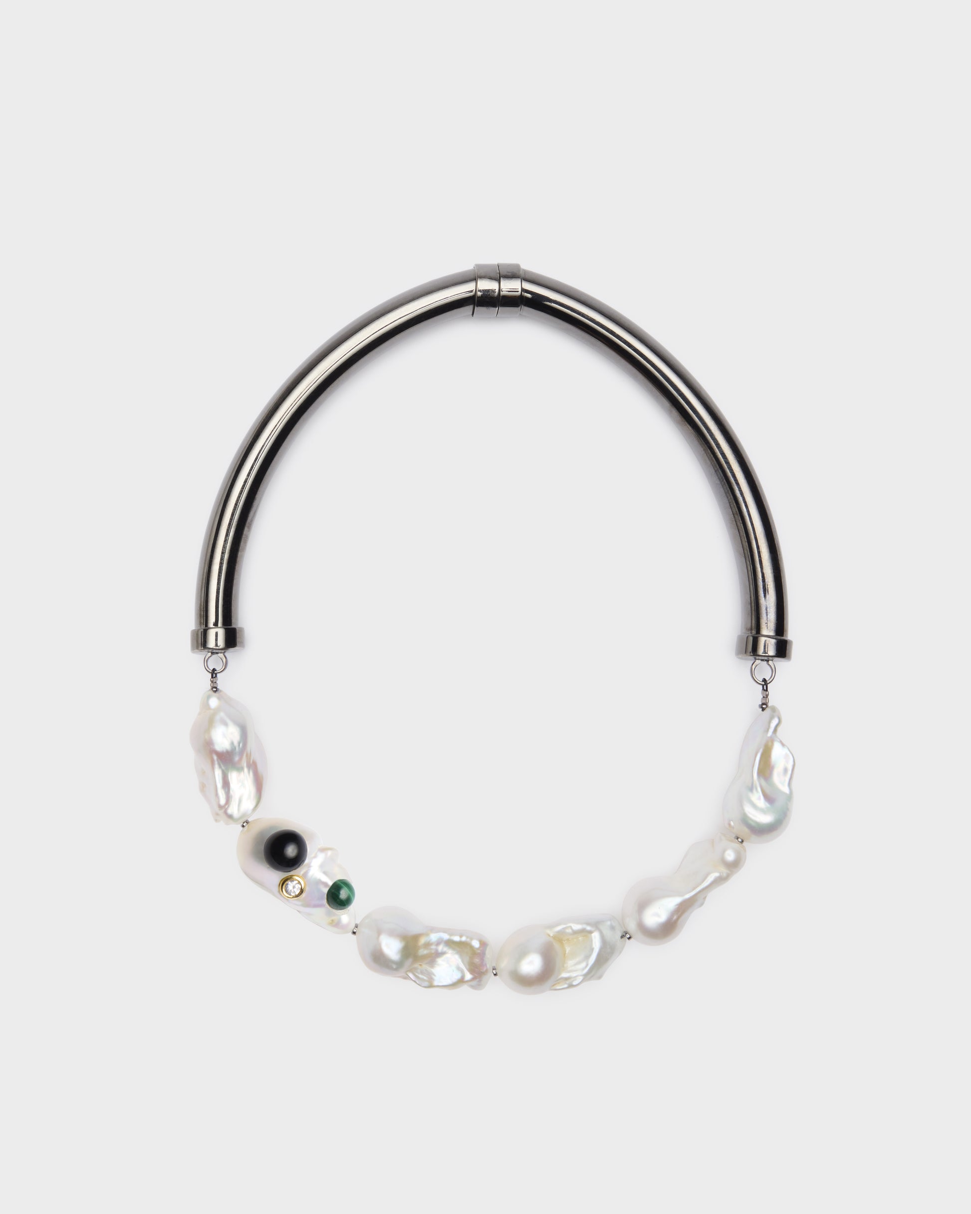Collana in ottone placcato rutenio, perla barocca e cabochon onice nero e malachite. Lock magnetico. Lavorazione artigianale.