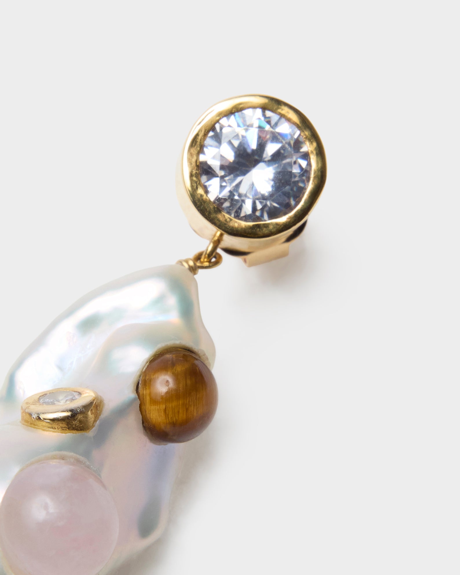 Orecchino singolo in argento placcato oro, zircone, perla barocca, cabochon quarzo rosa e occhio di tigre. Lavorazione artigianale.