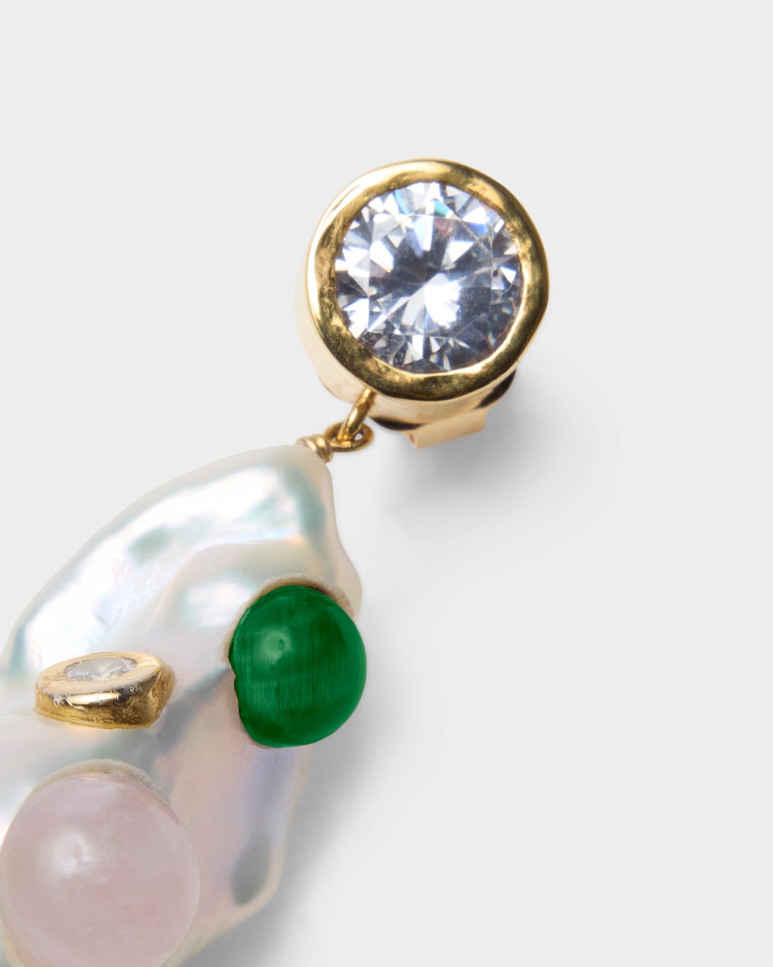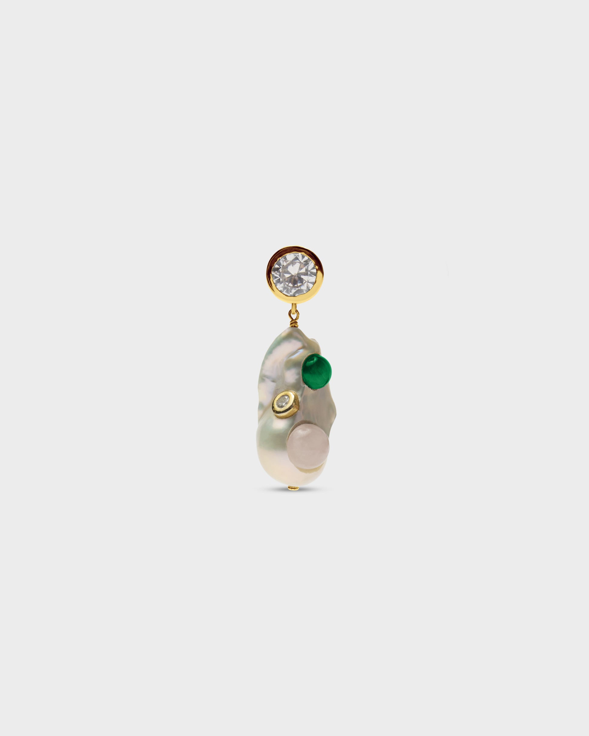 Orecchino singolo in argento placcato oro, zircone, perla barocca, cabochon quarzo rosa e malachite. Lavorazione artigianale.
