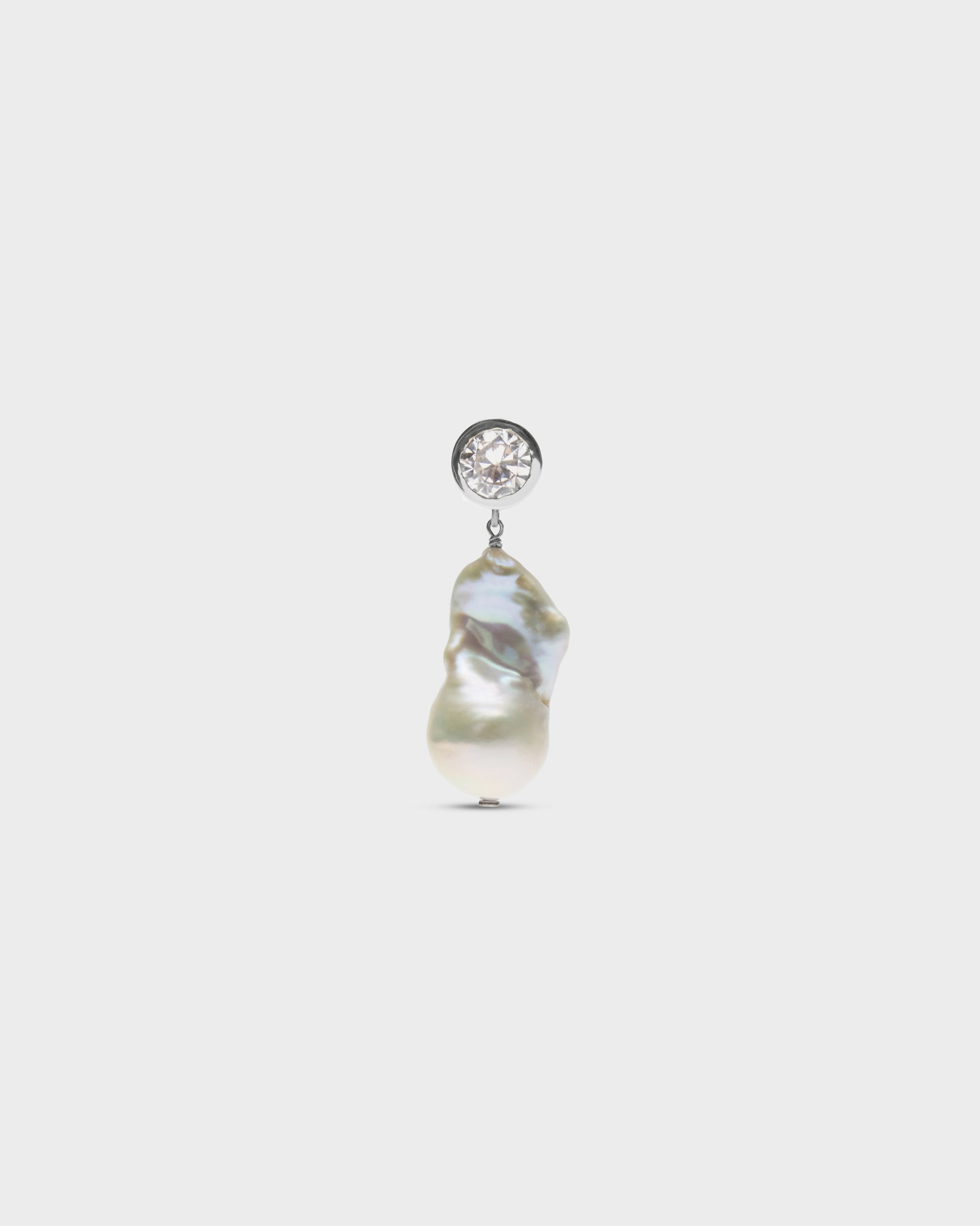 Orecchino singolo in argento placcato, zircone, perla barocca. Lavorazione artigianale.